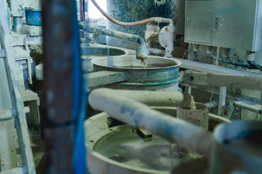 谷口製土所は自社製土所に加え斜向かいにある九谷セラミック・ラボラトリー(通称:セラボクタニ)の製土場を使用して、大きく 2 種類に分類される粘土を製造しています。本プログラムでは普段はセラボクタニのギャラリーよりガラス越しにしか見ることができない製土場の内部に入り、それぞれの工程によりどんな粘土がつくりだされるのか、じっくりと見学することができます。