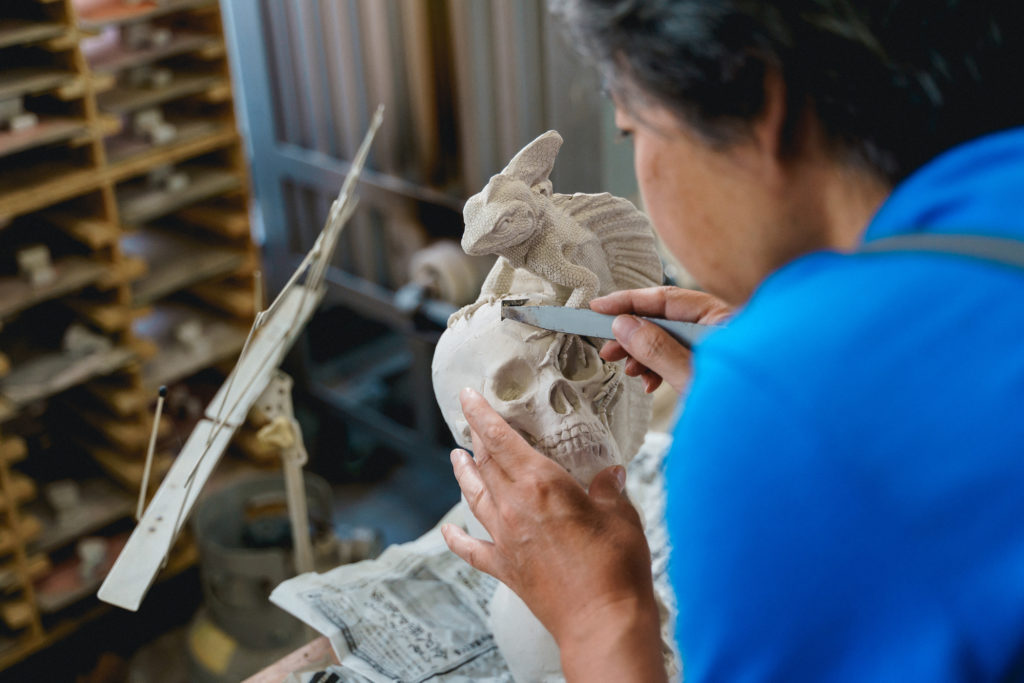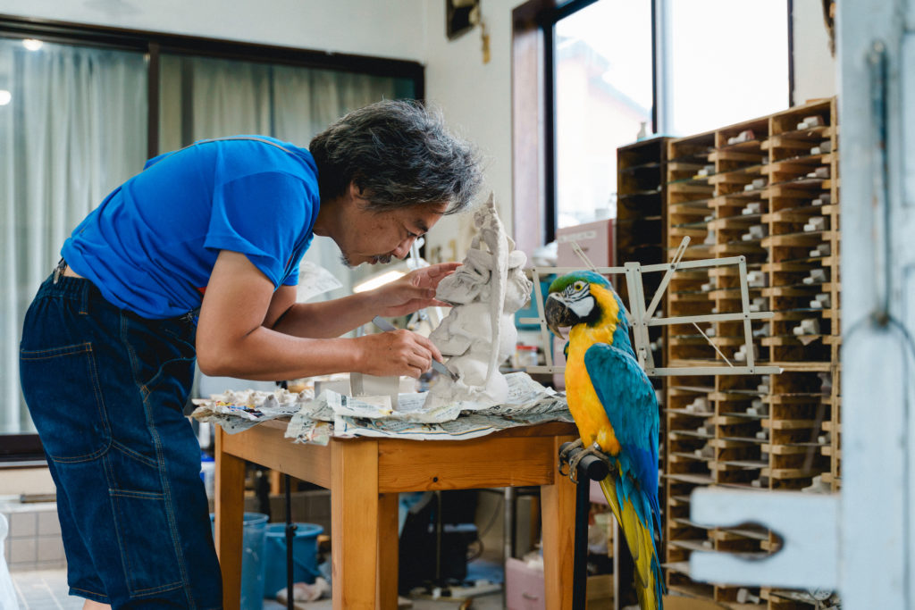 田畑氏の手から生まれる様々な置物のリアルな表情や動きは、ビジュアルだけでなく人であればその人となりを、動物であれば生態や生息地域など対象への様々な背景を研究することでつくりだされます。実際に工房は田畑氏の知的好奇心の源ともいえるたくさんの書籍や研究材料で溢れています。GEMBA開催期間中は、普段公開していない田畑氏のインスピレーションが詰まった工房を見学しながら所狭しと置かれた作品を覗いて見ることができます。ぜひおしゃべりしながら見学しに行ってみては。