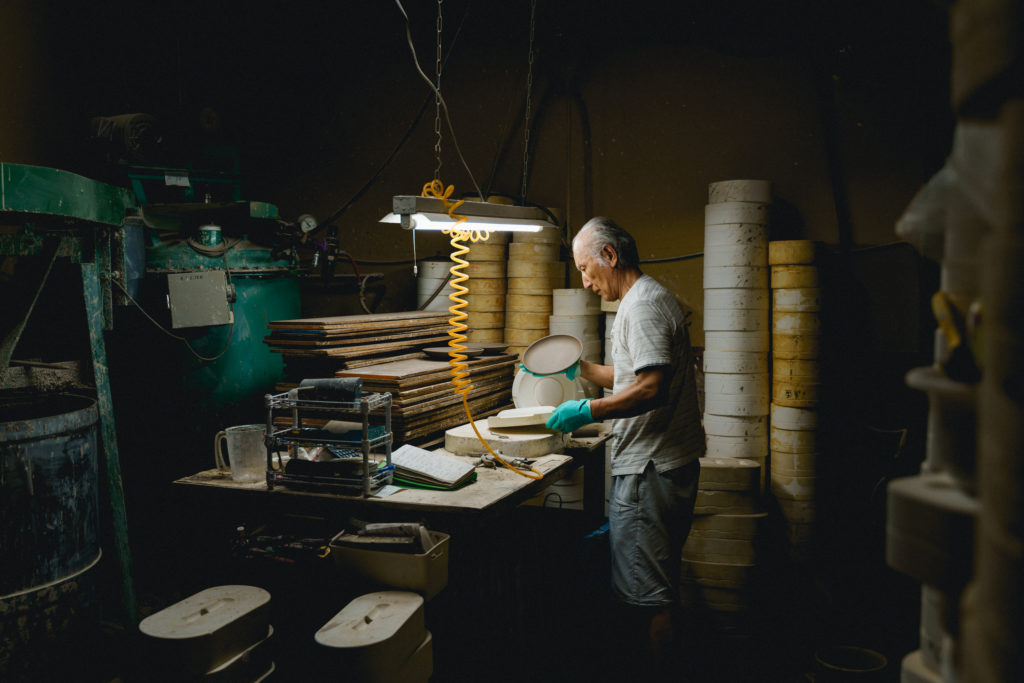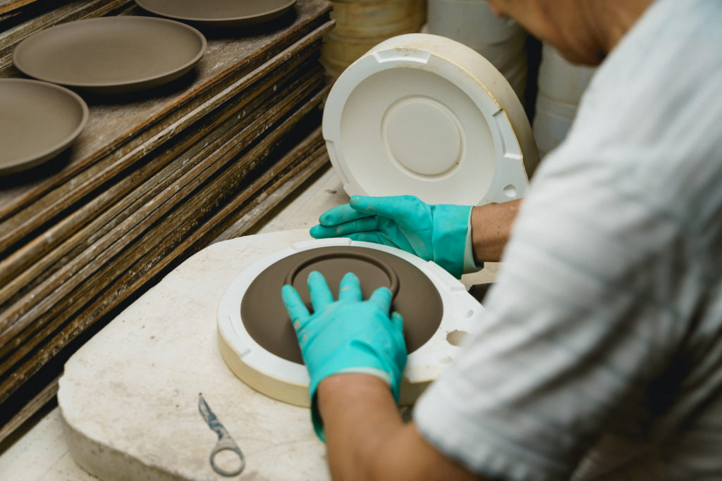 体験で行う“ろくろ”以外にも九谷焼の成形方法はたくさんあります。宮吉製陶の工場はろくろ以外にも様々な成形方法を見ることができます。焼物ってこうやってできるのか……!とまさに目から鱗。ぜひ産地でも随一の成形種類を誇る宮吉製陶の工場見学をお楽しみください。