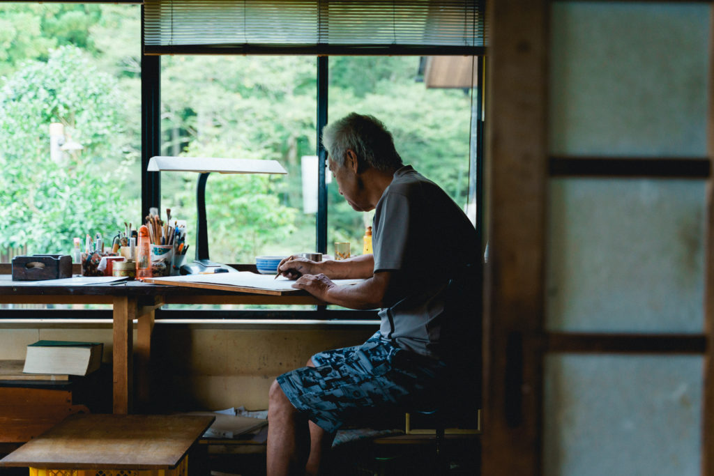 徳田八十吉陶房での修行の後に東京のデザインスクールに通ったという経歴を持つ宇喜多窯の浮田健剛氏。 彼が小松空港周辺から居を移してまで手に入れた作陶環境は、実際に足を運んでみると遊び心あるインスピレーションの源であることがよくわかります。工房周辺の自然豊かでのどかな環境、作業机の窓から目に飛び込む緑の眺望、そしてギャラリー内で時折行われる仲間との音楽セッション。それらからインスパイアされて生まれる浮田氏の作品のポップな作風には、「九谷焼」という言葉から連想されるクラシックなモチーフとは一味違うどこか親しみや温かさを感じます。GEMBAプログラムでは浮田氏の指導の元で絵付けの下絵を裏庭でスケッチするところから上絵付けを体験できます。緑に囲まれた中でのスケッチから始まる上絵付け体験は他にはない貴重な体験です。