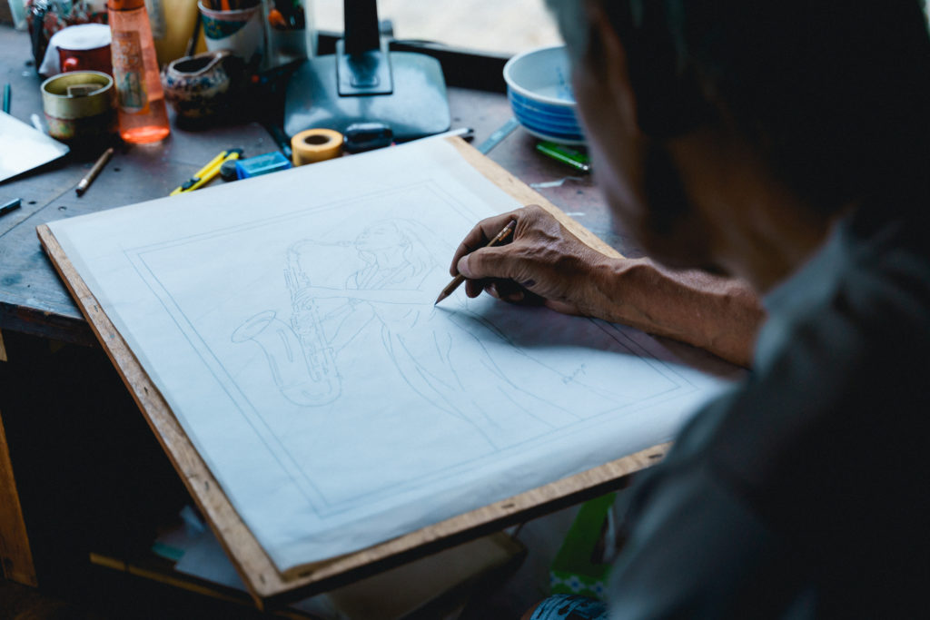 浮田氏は東京でデザインを学んでいた頃から音楽活動を行っており、その音楽への愛は楽器やジャズセッションをモチーフにした作品の端々に表れています。カフェ