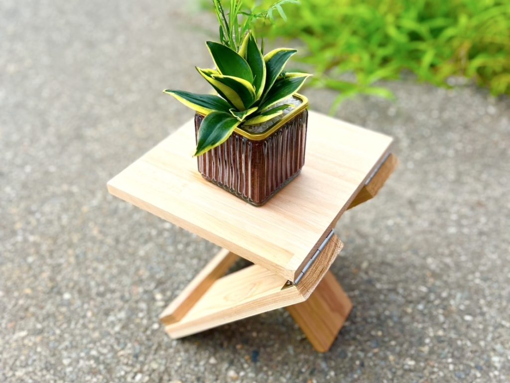 今回のプログラムでは小学生のお子さんから保護者の方と一緒に挑戦できるよう、比較的取り組みやすい折り畳みイスにしました。観葉植物を置いたりできるラックにもなります。工具を使い、職人がサポートのもと安全に製作いただけます。